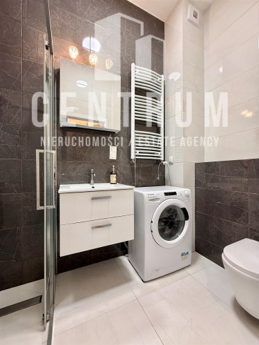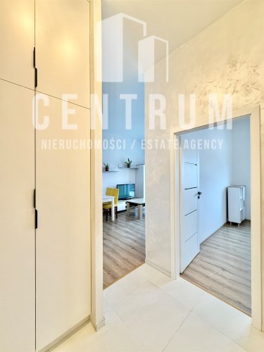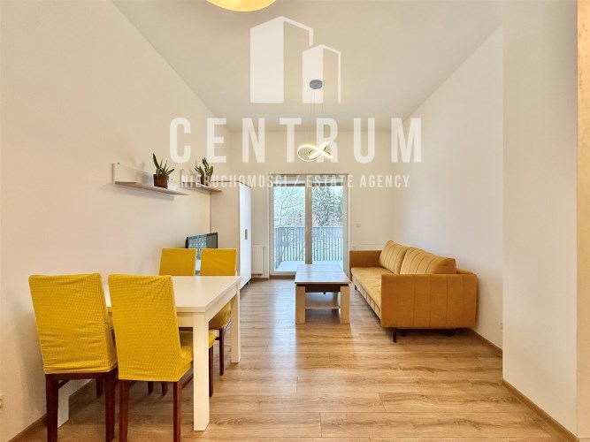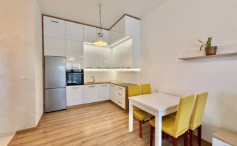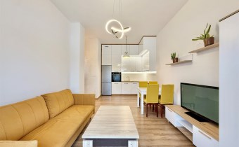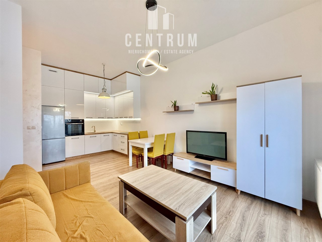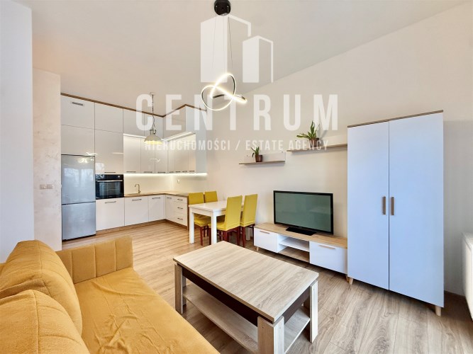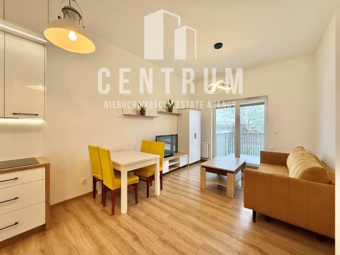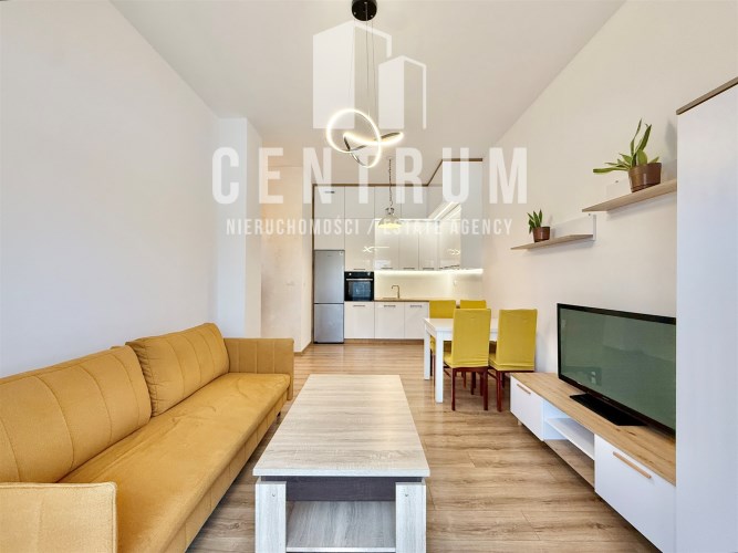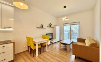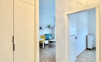Piętro 1, powierzchnia 43 m2 składa się z salonu z aneksem kuchennym, sypialni, łazienki z WC oraz przedpokoju. Mieszkanie posiada balkon. Całe mieszkanie jest w pełni umeblowane i wyposażone w dobrym standardzie. W salonie znajduje się rozkładana sofa, stolik kawowy stół z krzesłami, szafka pod telewizor + telewizor, szafa. W sypialni znajduje się rozkładana sofa + szafa. Kolejna duża szafa w zabudowie znajduje się w przedpokoju. Aneks kuchenny wyposażony w zmywarkę, piekarnik, płytę indukcyjną, lodówko-zamrażarkę. Łazienka wyposażona w kabinę prysznicową, umywalkę, pralkę.