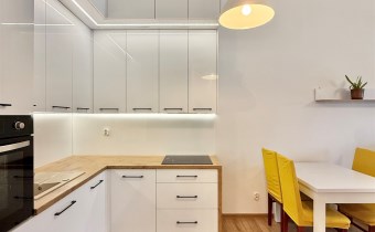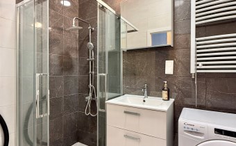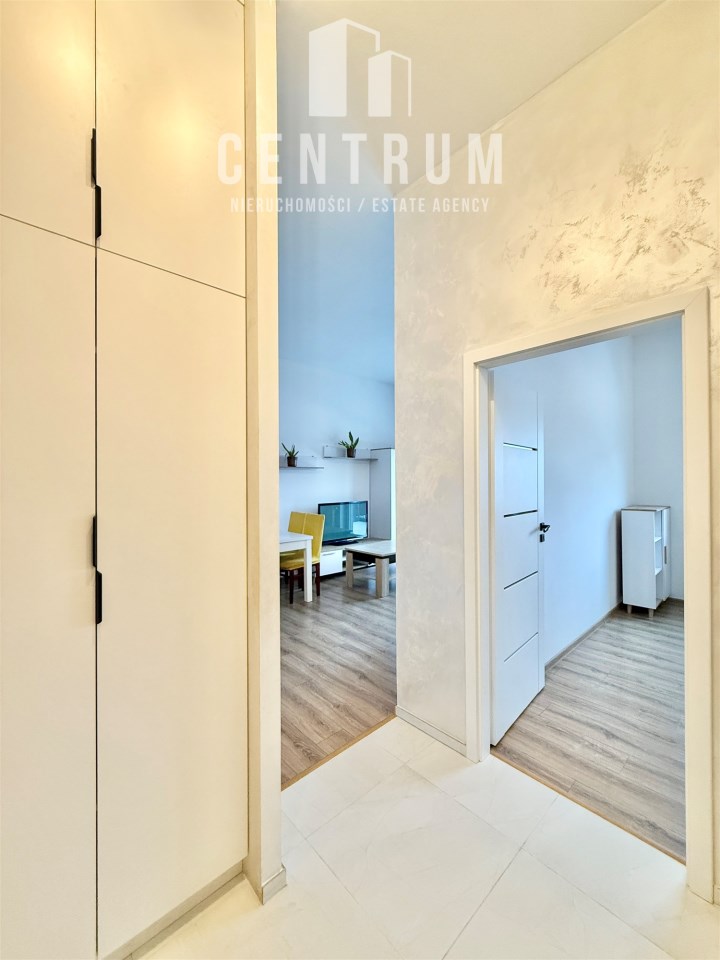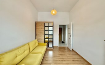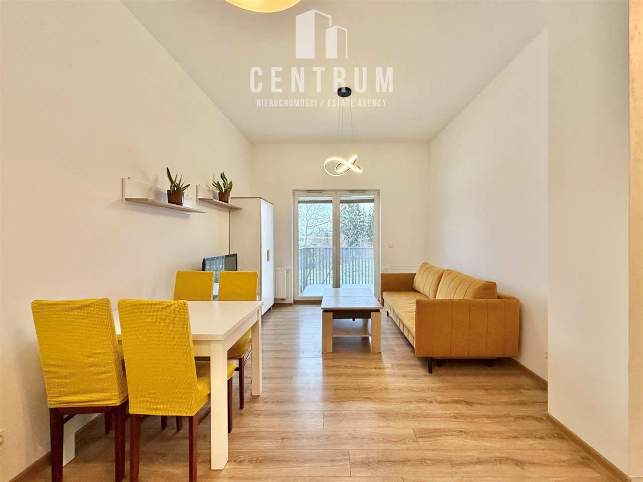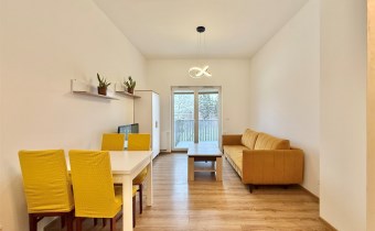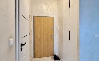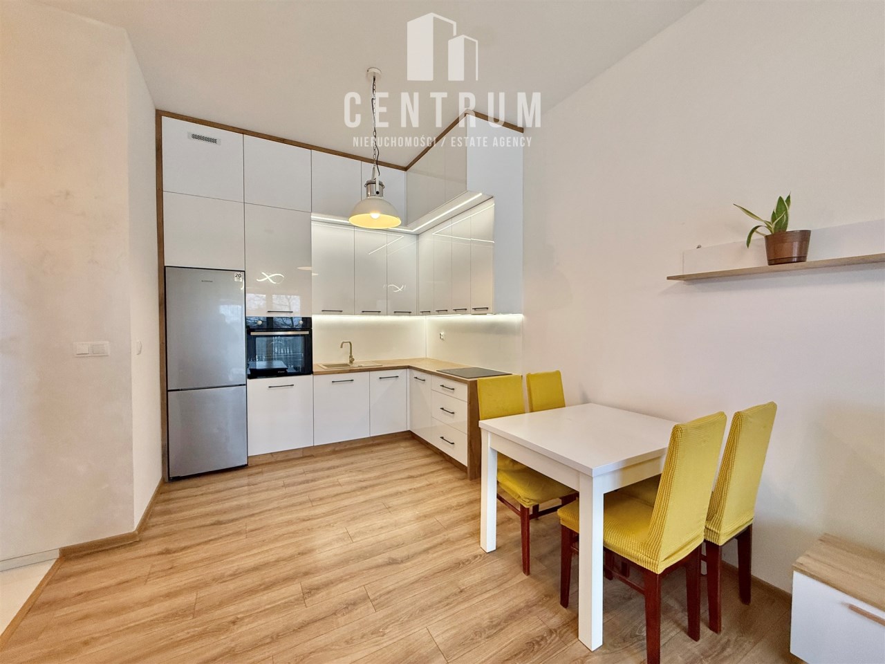 Piętro 1, powierzchnia 43 m2 składa się z salonu z aneksem kuchennym, sypialni, łazienki z WC oraz przedpokoju. Mieszkanie posiada balkon. Całe mieszkanie jest w pełni umeblowane i wyposażone w dobrym standardzie. W salonie znajduje się rozkładana sofa, stolik kawowy stół z krzesłami, szafka pod telewizor + telewizor, szafa. W sypialni znajduje się rozkładana sofa + szafa. Kolejna duża szafa w zabudowie znajduje się w przedpokoju. Aneks kuchenny wyposażony w zmywarkę, piekarnik, płytę indukcyjną, lodówko-zamrażarkę. Łazienka wyposażona w kabinę prysznicową, umywalkę, pralkę.